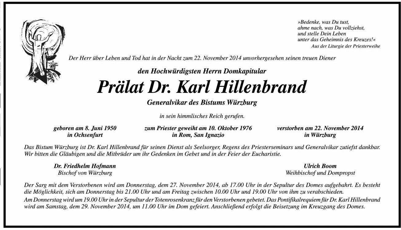Generalvikar Dr. Hillenbrand erwies sich als prinzipientreuer Mensch, der das gute menschliche Zusammenleben immer im Blick hatte und auf Konsens bedacht war. Die DiAG MAV C verliert einen Ansprechpartner, der ein offenes Ohr für die Situation der kirchlichen Schulen der Orden und Stiftungen hatte und auf Prävention an den Einrichtungen für Kinder und Jugendliche großen Wert legte.